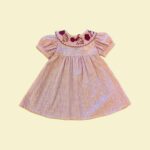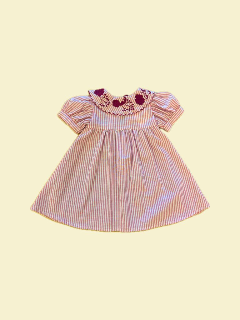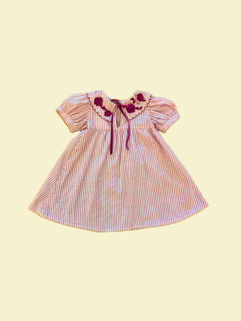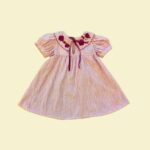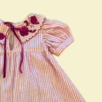 Vestido corte clássico com saia franzida, corpo encurtado, mangas bufantes com punhos e gola estilo peter pan com detalhes bordados. Abertura na frente com fita de veludo que faz o fechamento e detalhe de laço. Comprimento um pouco abaixo do joelho.